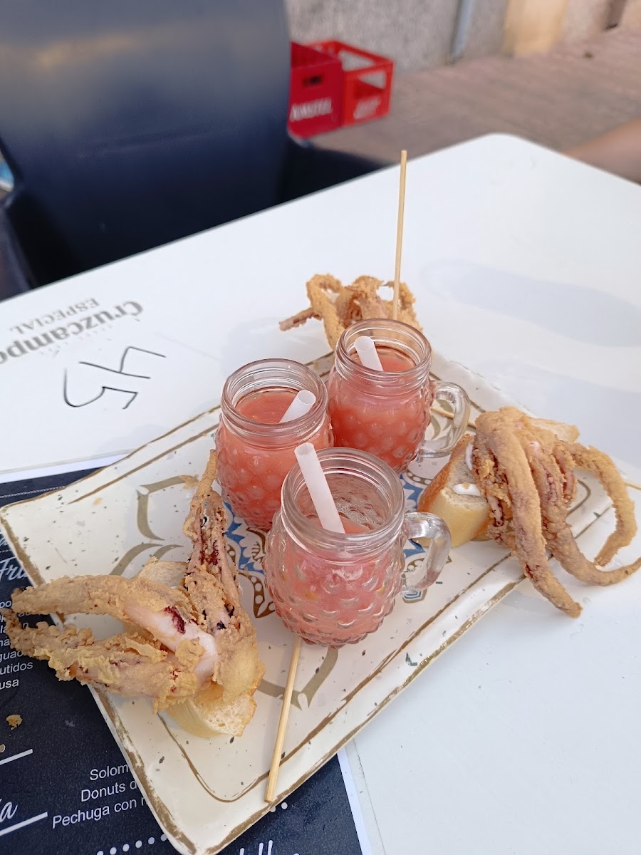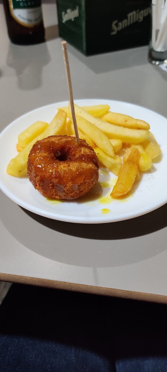 Among the standout dishes on the menu, the Sardinas en Salazón (salted sardines) truly capture the essence of Andalusian cuisine. This dish is a must-try for seafood lovers, offering a savory and rich flavor that will transport you straight to the coast. For those who enjoy a bit more variety, the Mollejas (sweetbreads) offer a delightful texture and deep, satisfying taste, while the Tapa de Rejos con Gazpacho (tentacle tapas with gazpacho) combines the freshness of the iconic Spanish cold soup with the tender bite of octopus. And don't miss the Donuts de Pollo con Miel y Mostaza (chicken donuts with honey and mustard), a sweet and savory combination that's both unique and irresistible.